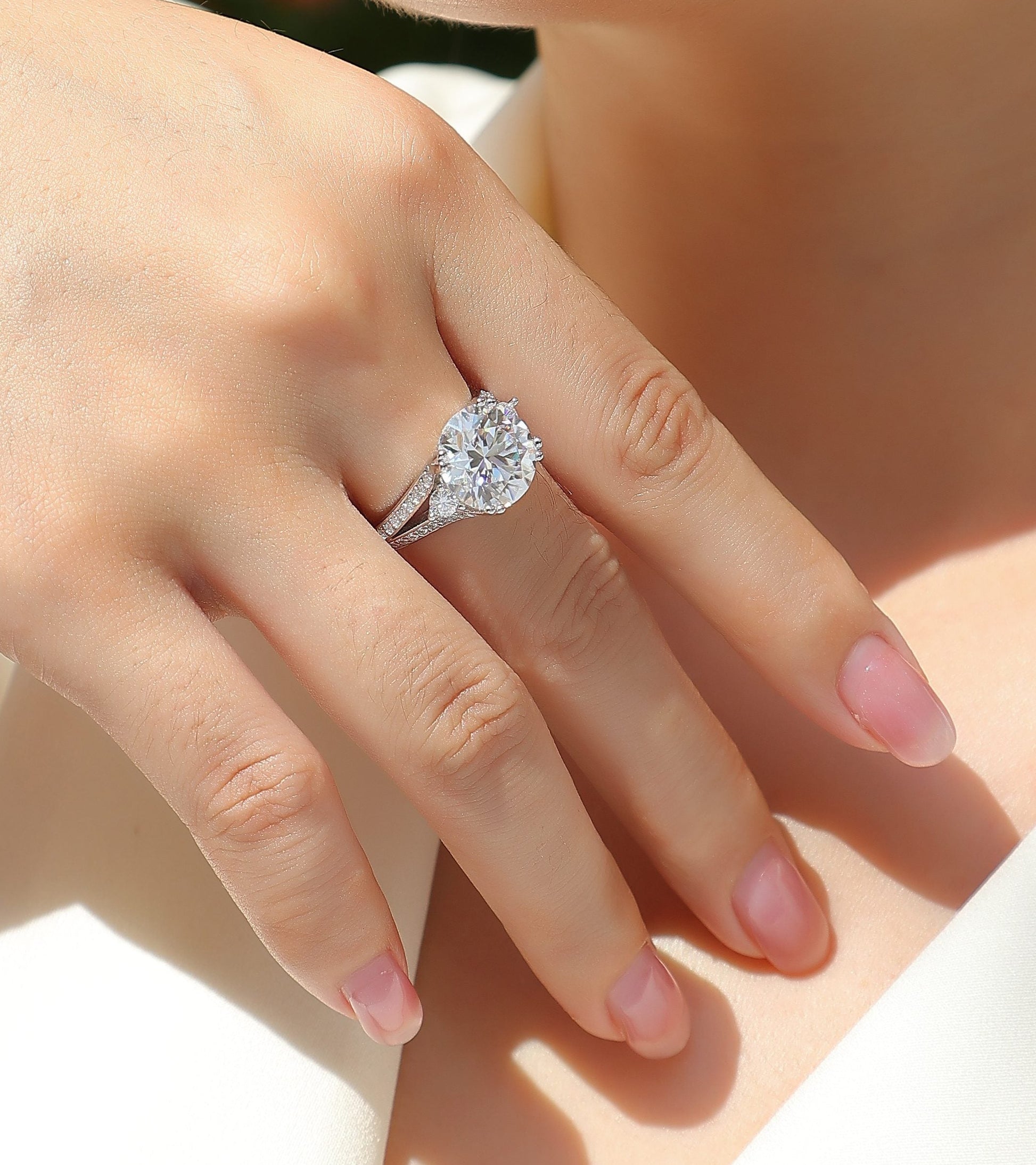 - Spectacular 5 Carat Center Stone – Features a massive, precision-cut 5-carat Moissanite gemstone. Known for having more fire and brilliance than a natural diamond, this stone ensures a blinding sparkle from every angle.